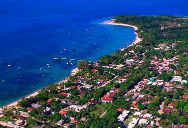 The main beach of the village has white sand and calm water, without waves. Som bars sell drinks and seafood.